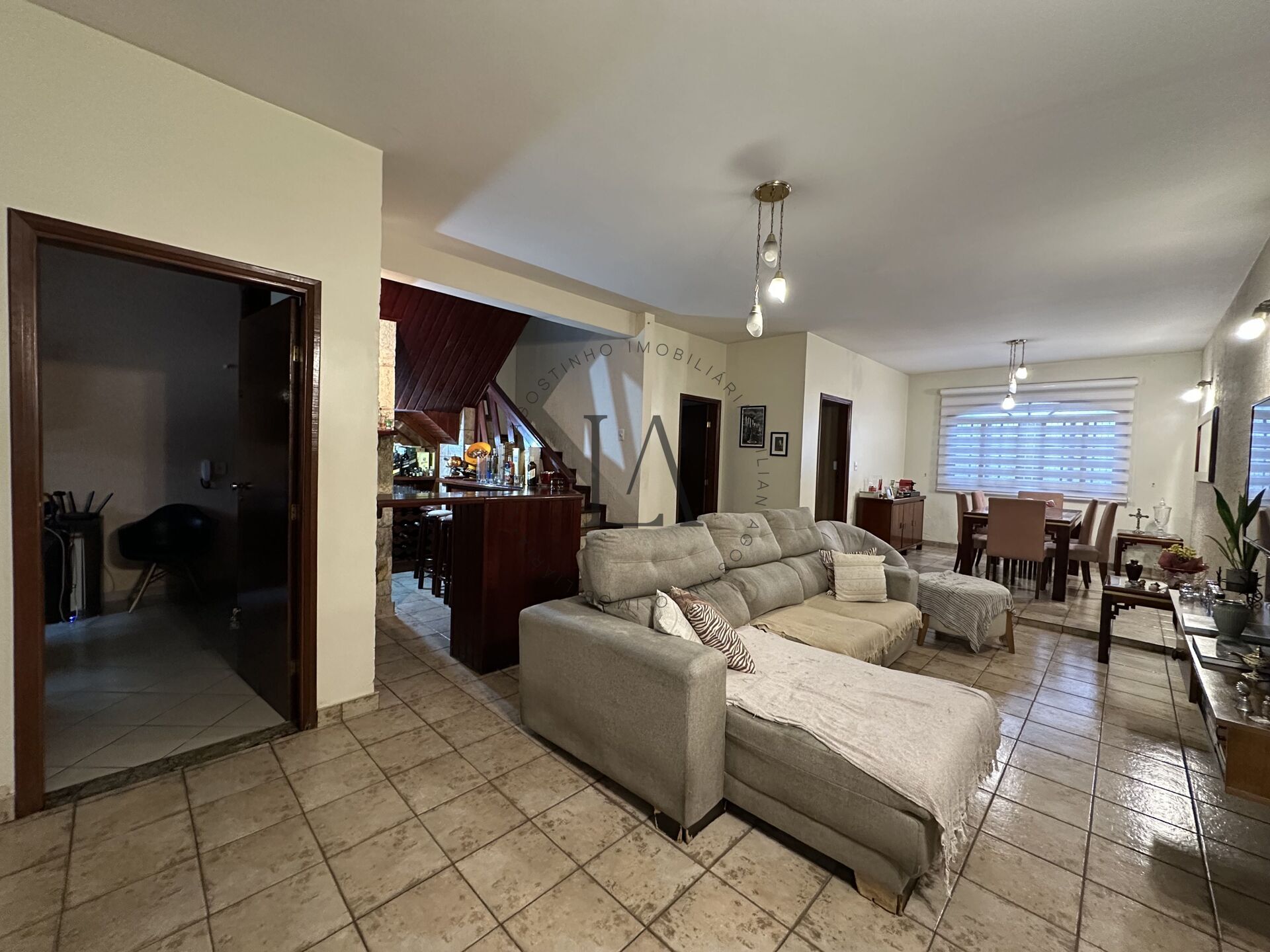 A casa principal conta com sala ampla para dois ambientes, proporcionando um espaço elegante e acolhedor para convivência. O imóvel dispõe ainda de escritório com entrada independente, ideal para quem trabalha em casa ou precisa de um ambiente reservado para atendimento profissional. A cozinha planejada traz praticidade ao dia a dia, complementada por lavabo e área de serviço.