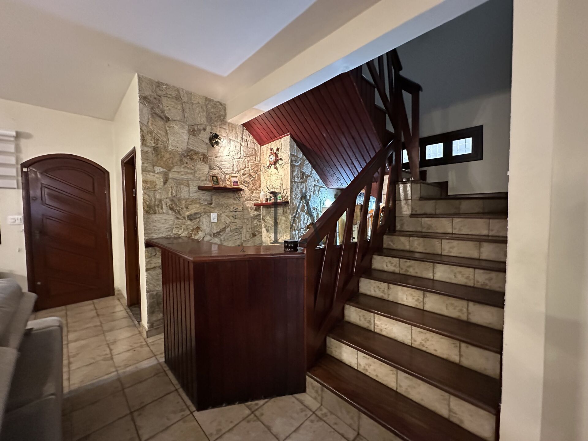 Um dos destaques da residência é a elegante escada em mogno, que conduz ao pavimento superior, onde estão os 4 dormitórios, sendo 1 suíte com closet. O pavimento também conta com banheiro social e sacada, garantindo ventilação e iluminação natural aos ambientes. A casa dispõe ainda de garagem coberta para 2 veículos.