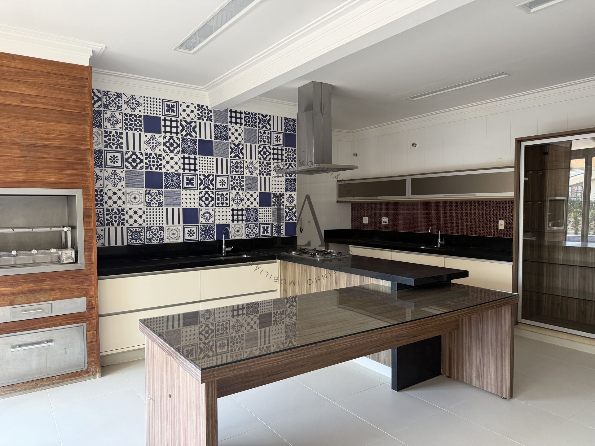 Logo na entrada, um espaço versátil chama a atenção: uma suíte térrea que pode ser utilizada como quarto de hóspedes ou escritório, ideal para quem busca funcionalidade. As salas de estar e jantar, amplas e bem iluminadas, têm integração direta com o jardim e com o espaço para reuniões ao ar livre, que traz charme e sofisticação com seu piso em mosaico de cerâmica com desenhos portugueses.