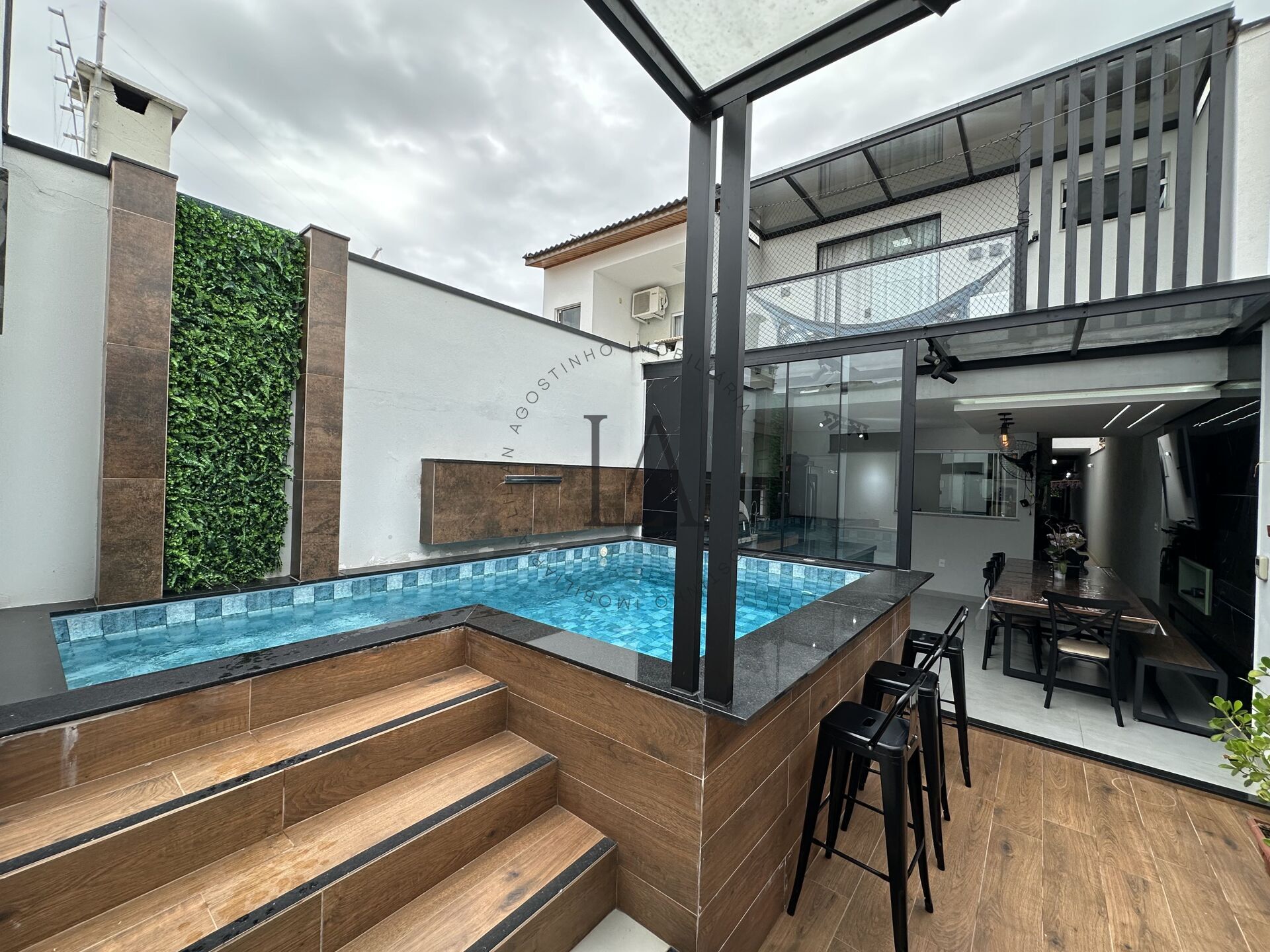 A área gourmet se destaca pelo design impecável, com pergolados de vidro com controle solar, que reduzem a temperatura, criando um espaço agradável o ano todo. Cada detalhe da casa foi milimetricamente planejado para uma rotina prática e funcional.