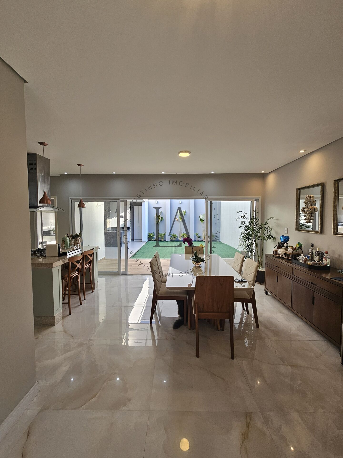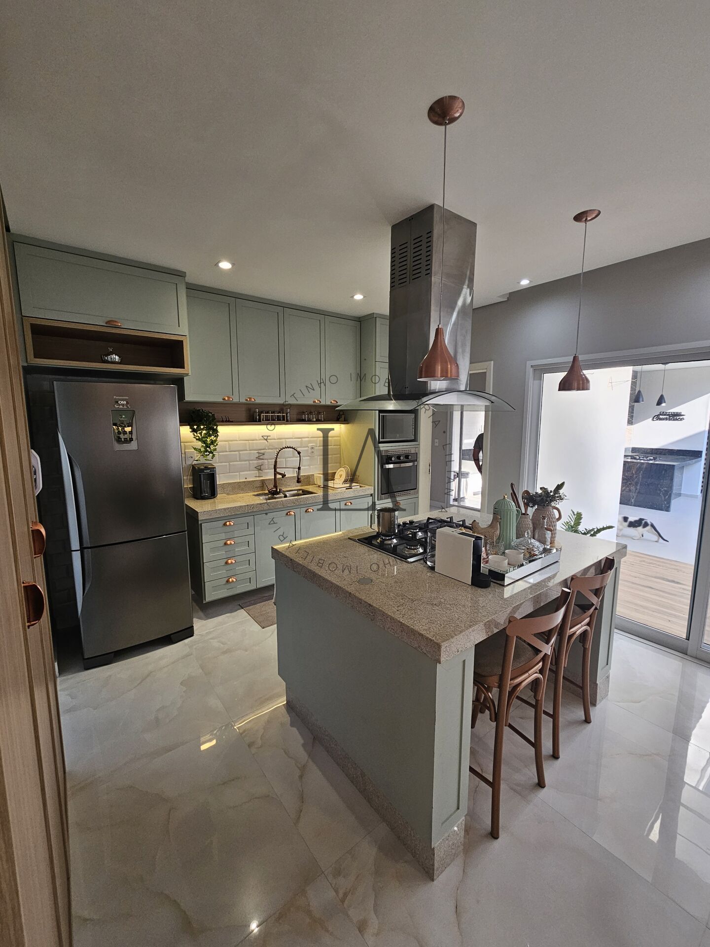 Logo na entrada, a ampla sala integra-se harmoniosamente à área de lazer e à cozinha em ilha — o verdadeiro destaque da casa. Com armários na elegante tonalidade menta e puxadores acobreados, ela adiciona sofisticação e charme ao ambiente, valorizando ainda mais a sala de jantar.
